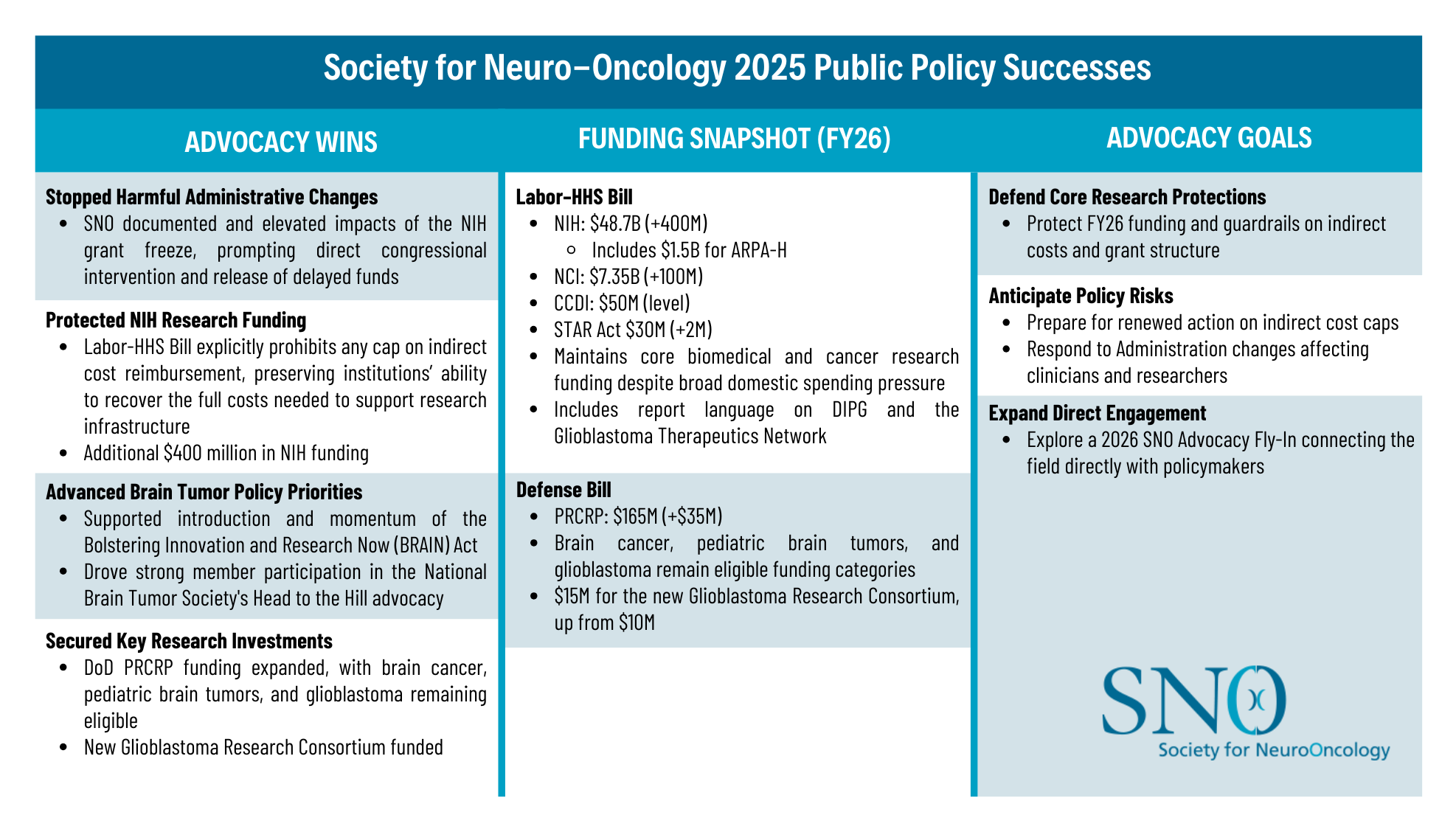 The graphic below outlines SNO’s FY2025 priorities and advocacy goals for FY2026.